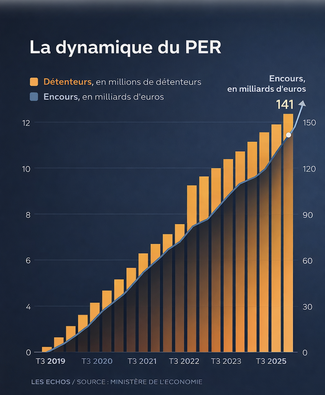 Une croissance exceptionnelle depuis 2019Le rôle déterminant de l’avantage fiscal à l’entréeUne innovation majeure : la possibilité de sortie en capitalUne montée en puissance liée à l’inquiétude sur l’avenir des retraitesUn outil au service du financement de l’économie réelleUne gestion pilotée largement standardiséeLe risque d’un produit perçu uniquement comme un outil fiscalUne transformation silencieuse du modèle français de retraiteLe véritable enjeu : passer du succès commercial à la réussite patrimonialeEn brefDepuis sa création par la loi Pacte en 2019, le Plan d’Épargne Retraite (PER) s’est imposé comme l’un des produits d’épargne les plus dynamiques du paysage financier français. Les chiffres récents confirment cette montée en puissance : près de 12,7 millions de Français détiennent désormais un PER, pour plus de 141 milliards d’euros d’encours à fin 2025.